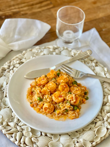 Arroz Branco, Azeite Extra Virgem, Camarão, Cebola, Cenoura, Coentro, molho de tomate, Parmesao, Sal, Tomate e Ervilha Fresca