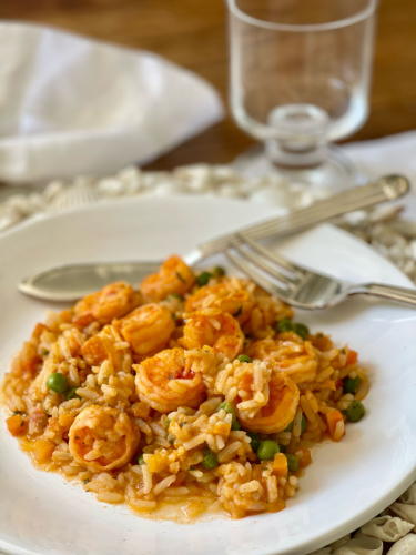 Arroz Branco, Azeite Extra Virgem, Camarão, Cebola, Cenoura, Coentro, molho de tomate, Parmesao, Sal, Tomate e Ervilha Fresca