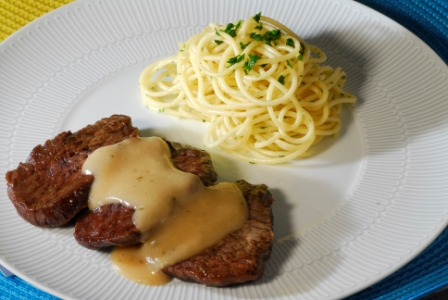 Alho, Azeite Extra Virgem, Cebola, farinha de trigo enriquecida c/ ac folico e ferro, File Mignon, leite desnatado, Limao, Manteiga, massa alimenticia grano duro, molho ingles, Óleo de soja, Sal e Salsa