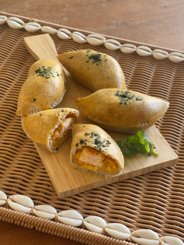 Alho, Azeite Extra Virgem, Camarão, Cebola, Coentro, farinha de trigo enriquecida c/ ac folico e ferro, farinha de trigo integral, Fermento em pó, leite de coco light, maisena, Manteiga, Ovo, Sal, Salsa e Tomate