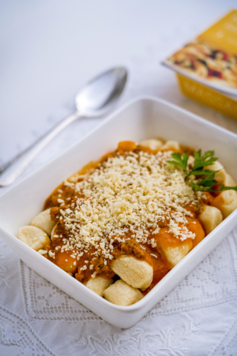 Alho, Azeite Extra Virgem, Cebola, cha, farinha de trigo enriquecida c/ ac folico e ferro, Manjericao, Manteiga, oregano, Ovo, Queijo Parmesão, Sal, Salsa, Tomate e Batata Asterix