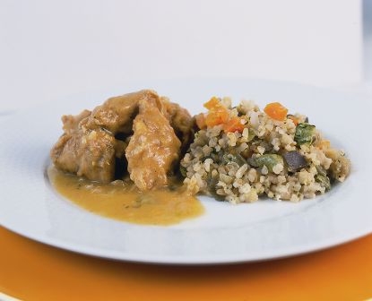 Abobrinha, Alho, Arroz Integral, Azeite Extra Virgem, Berinjela, Cebola, Cenoura, curry, File de Coxa, Maça, molho de tomate, óleo de canola, Parmesao, Sal e Salsa