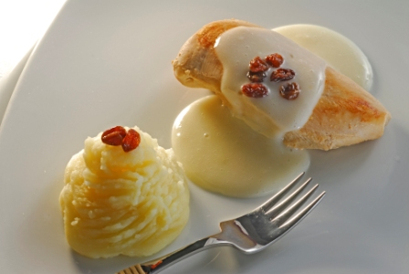 Alho, Batata, farinha de trigo, file de peito de frango, leite desnatado, Manteiga, Molho Shoyo, passas e Sal